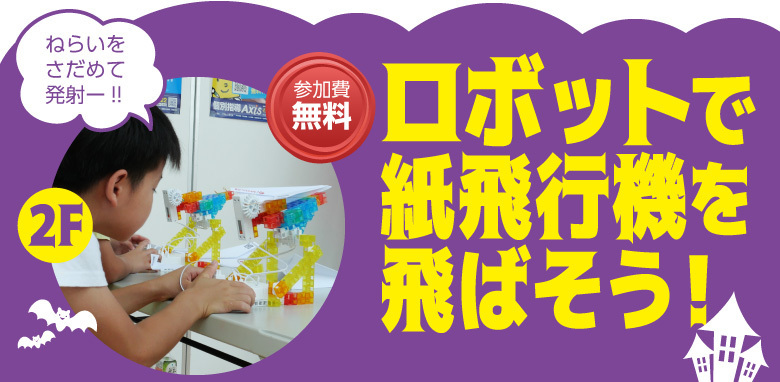 ロボットで紙飛行機をとばしてみよう。向きを変えながらどれだけ飛べるかにちょうせん! 夢中になって試行錯誤・工夫する楽しさを体験し、プログラミングの考え方にも触れられるワークショップです。