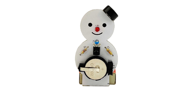 雪だるまの形の基板「ゆきピカ」はテレビなどのリモコンの信号を検知してLEDランプがひかり、音が出ます。部品点数も少なく、はんだ付け初心者の方に最適な工作です。